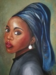 2019Eigen interpretatie van 'Meisje met de parel'. Ingelijst in baklijst met goudkleurige rand.