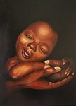 2017Portret baby. Het schilderij is ingelijst in een zwarte baklijst.