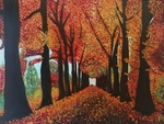 2017Dit schilderij is een pointellistische weergave van een herfstbos in Oost-Nederland. In de verte zijn 2 teckeltjes te zien. Het is ingelijst in een bruine baklijst.
