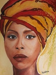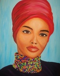 2018Schilderij geinspireerd door een foto van Jimmy Nelson. Op het schilderij zijn kralen en touw verwerkt.