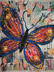2020De vlinder geeft een gevoel van vrijheid, vastgelegd op een krant met nieuwberichten van onze wereld. Natuurlijk aan jouw fantasie en gevoel op welke manier je dit doek interpreteert.